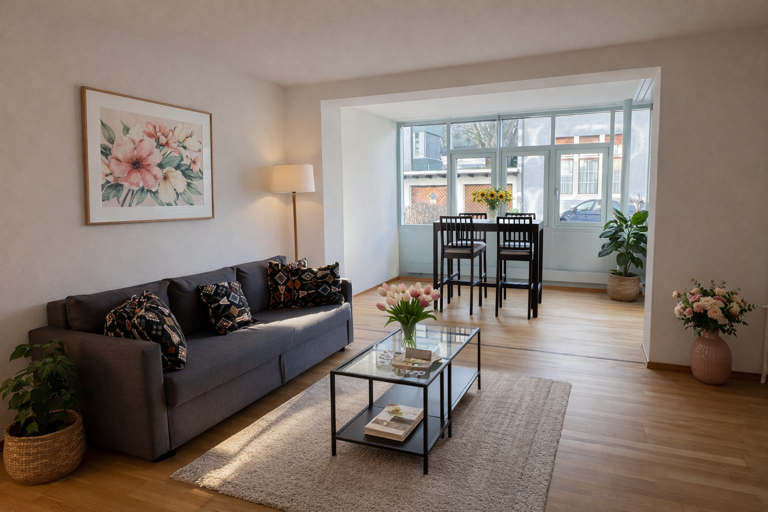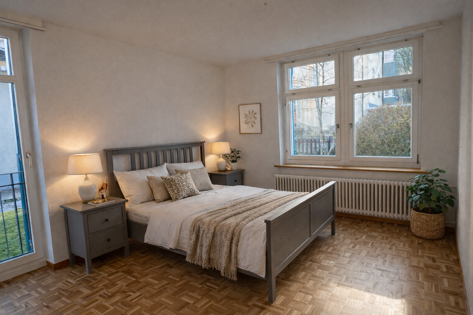 Die Nebenkostenpauschale beinhaltet Heiz- und Wasserkosten, Wohnungsstrom sowie Glasfaser-Internet.