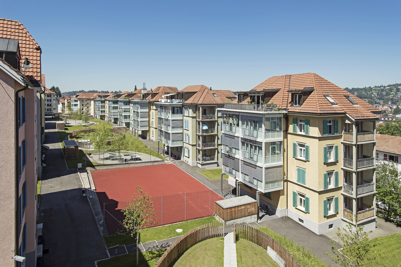 Die Siedlung hat einen grossen Innenhof mit Spielplatz und Gartenbeeten.